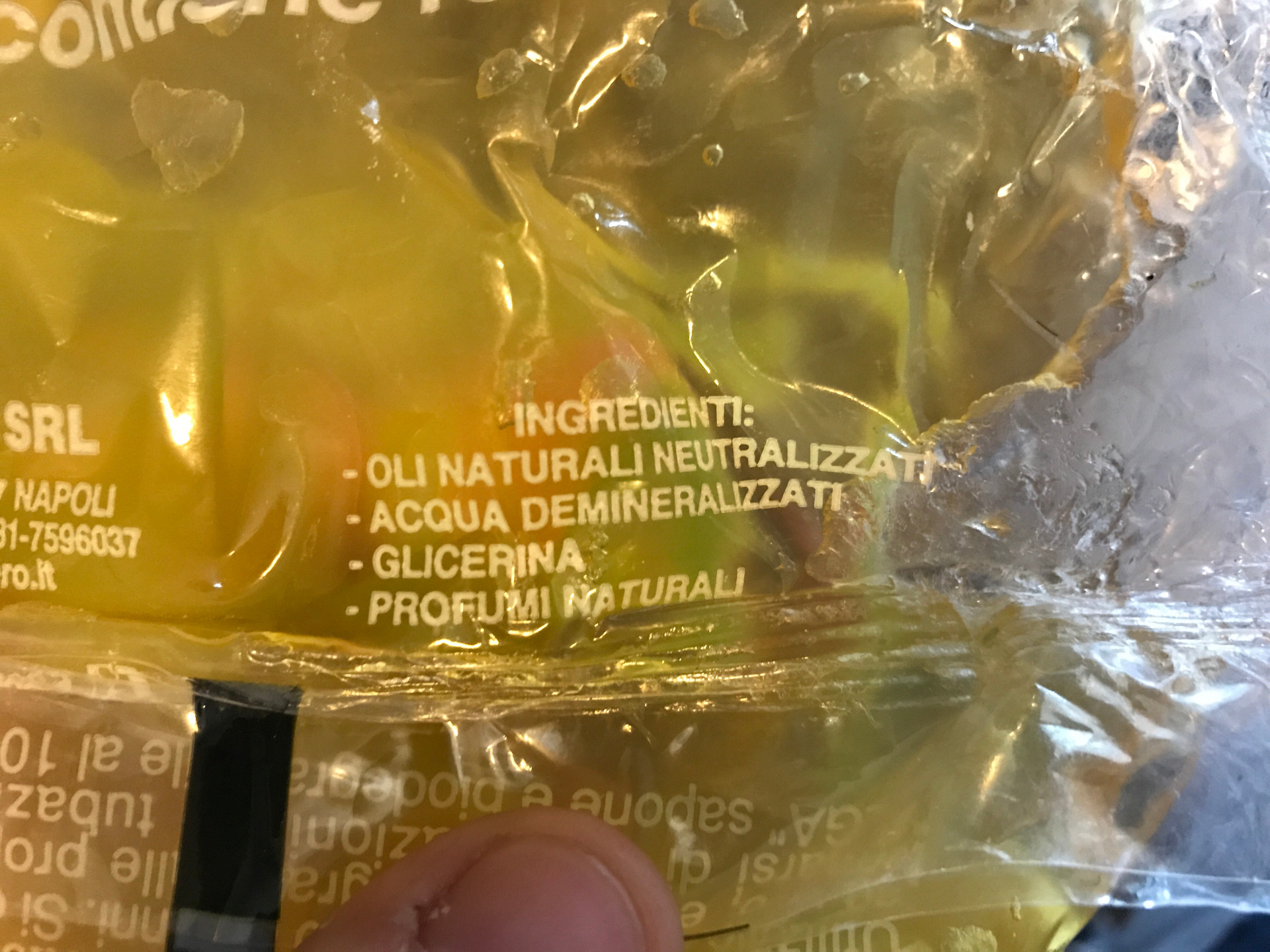 QUESTI SONO GLI INGREDIENTI DI UN SAPONE COMMERCIALE POCO INQUINANTE, SOLITAMENTE SONO PRESENTI ANCHE GLI SBIANCANTI OTTICI, CHE DANNO UNA SENSAZIONE DI PULITO, SEMPLICEMENTE RIFLETTENDO LA LUCE